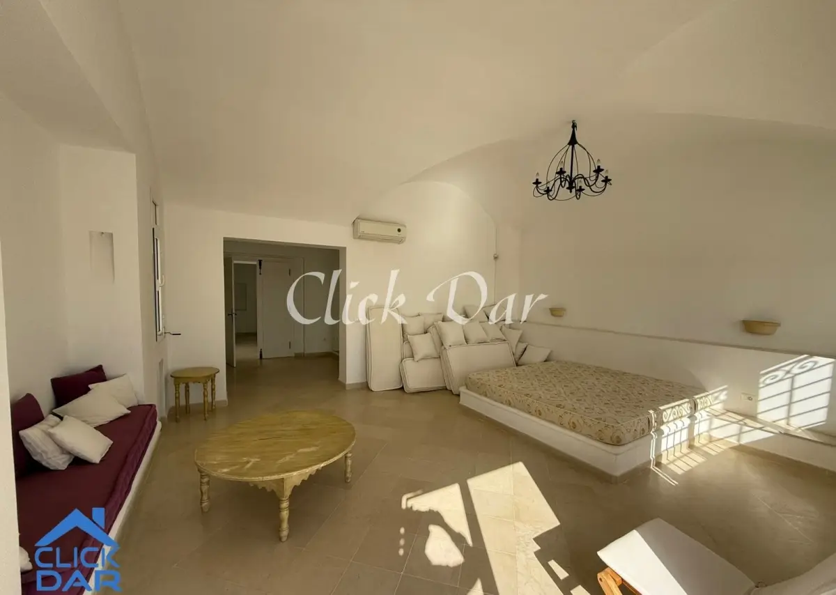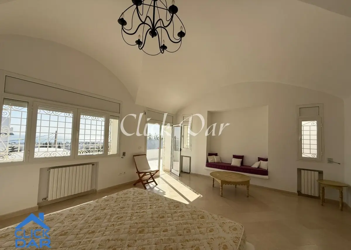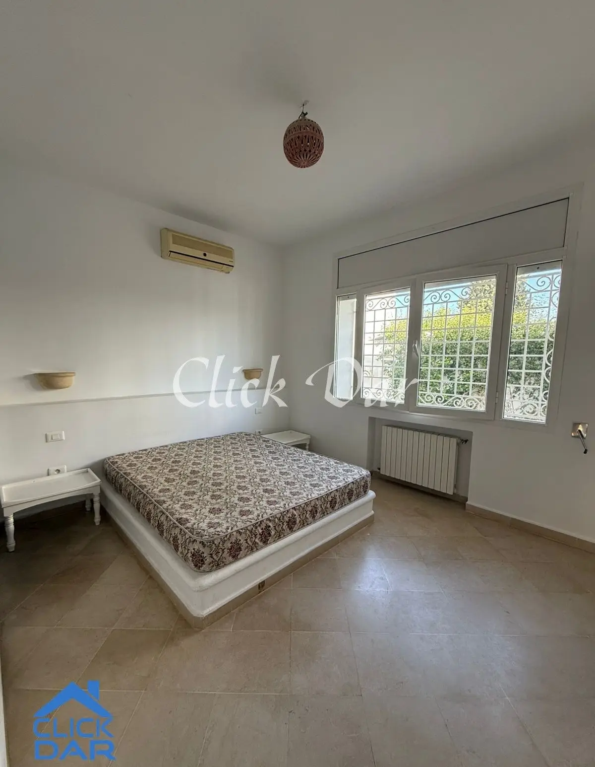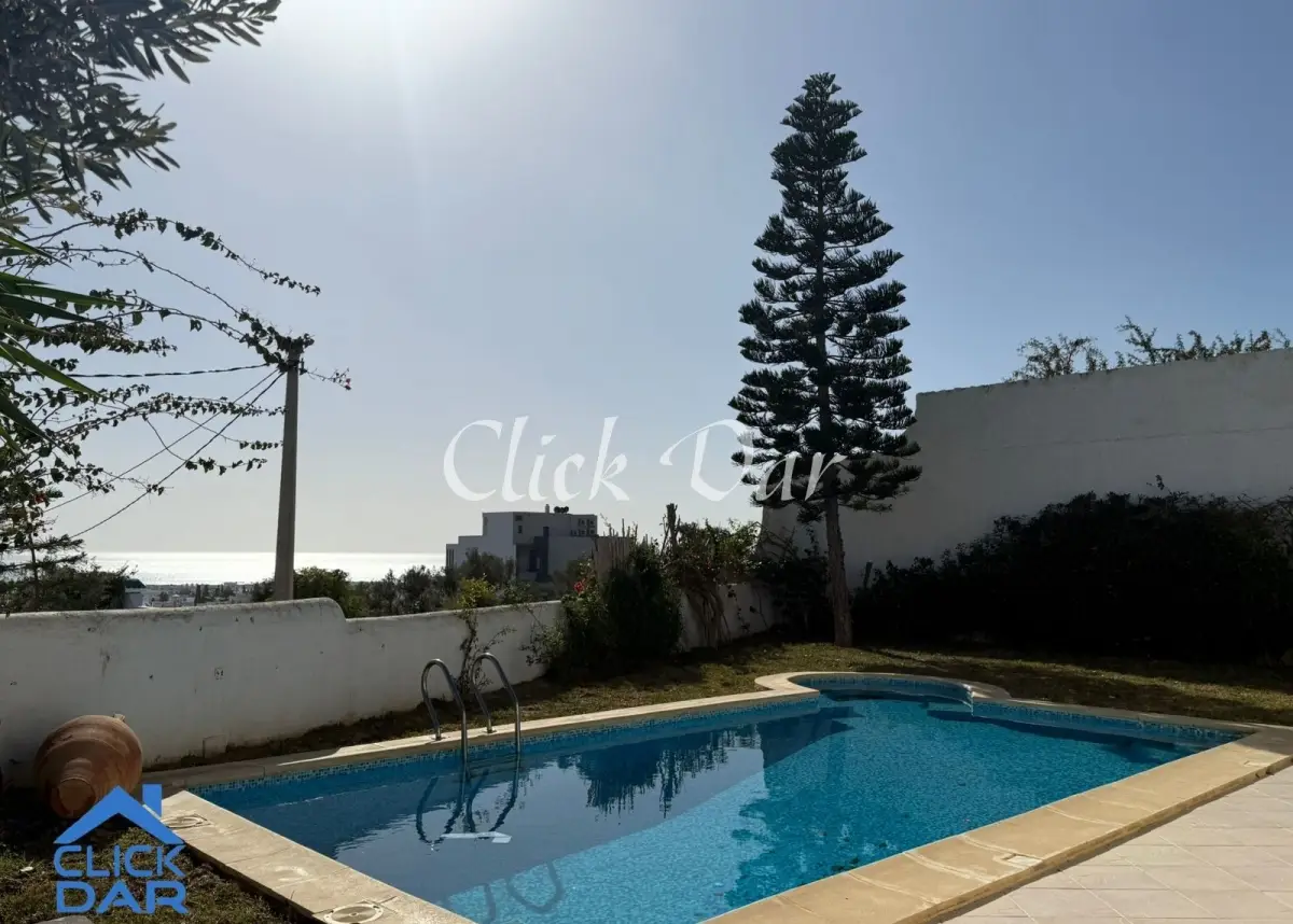 L’agence immobilière « Click Dar » vous propose pour la location annuelle, une villa en S+4 avec un vaste jardin, piscine et une terrasse vue mer, située à Hammamet Nord-cité Raboua.