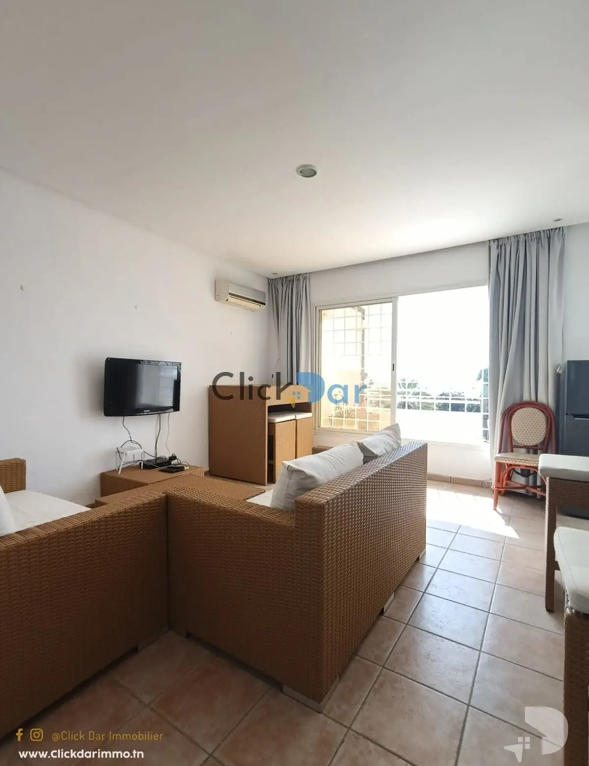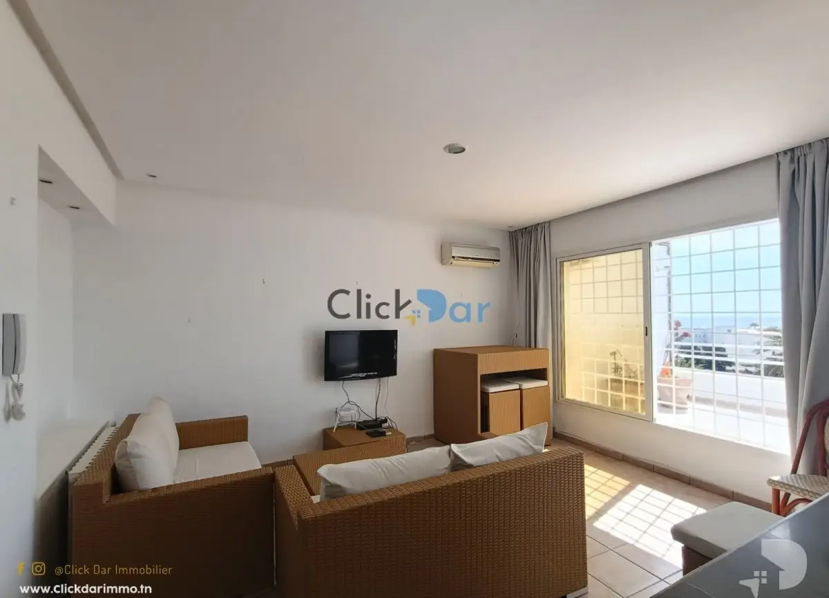 Click Dar Immobilier Hammamet vous propose pour la location annuelle, un appartement en S+1 au 4éme étage, situé à Hammamet à proximité Hotel Bel Azur.