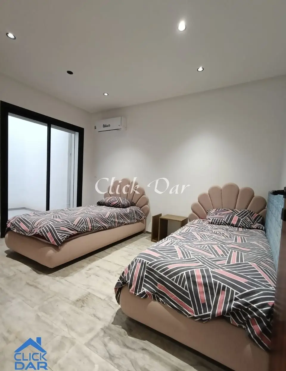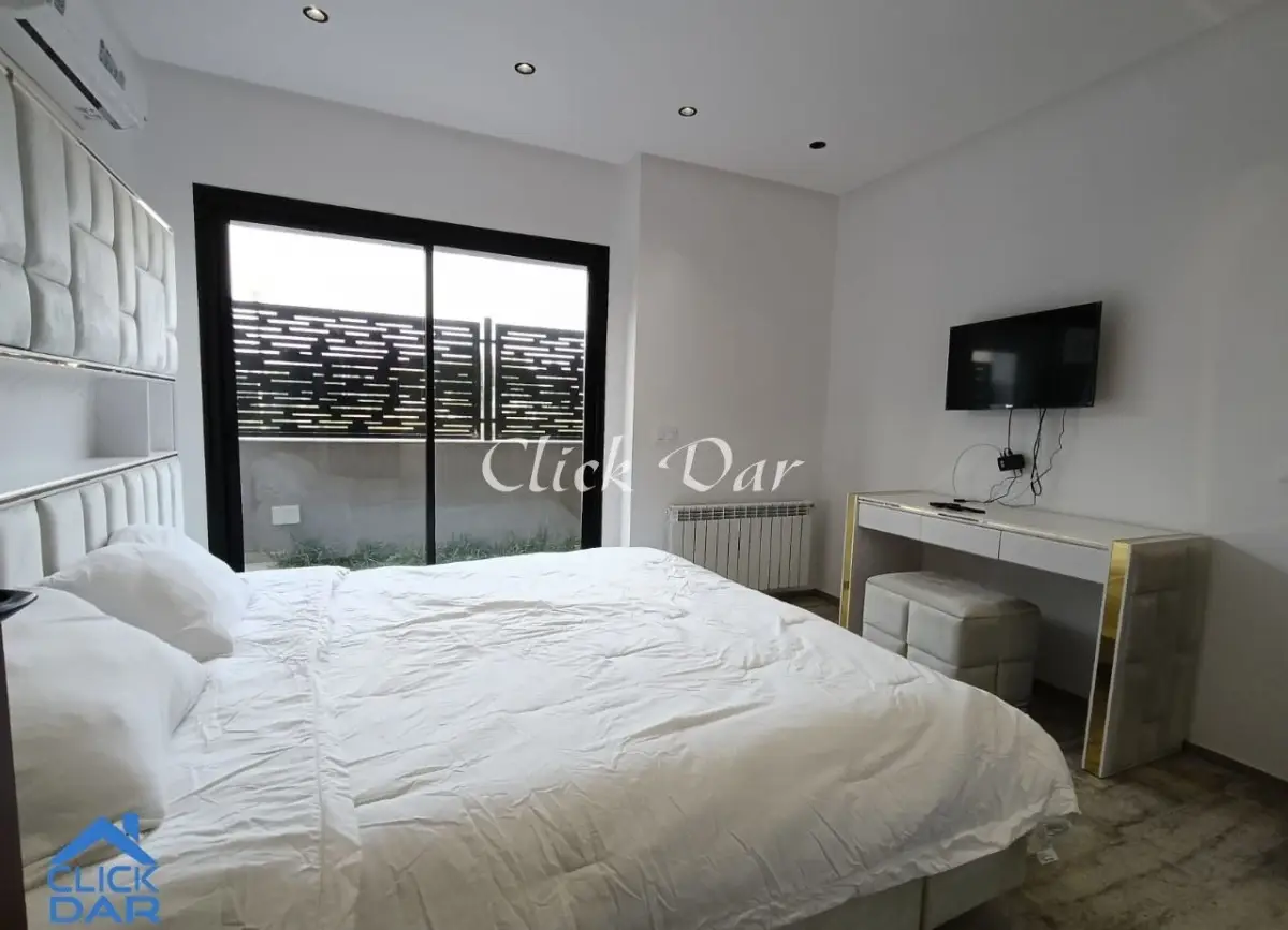 Pour la location annuelle, l'agence immobiliére "Click Dar" vous propose un RDC en S+3 avec jardin et piscine privée, d’une résidence sécurisée et gardée à Hammamet.