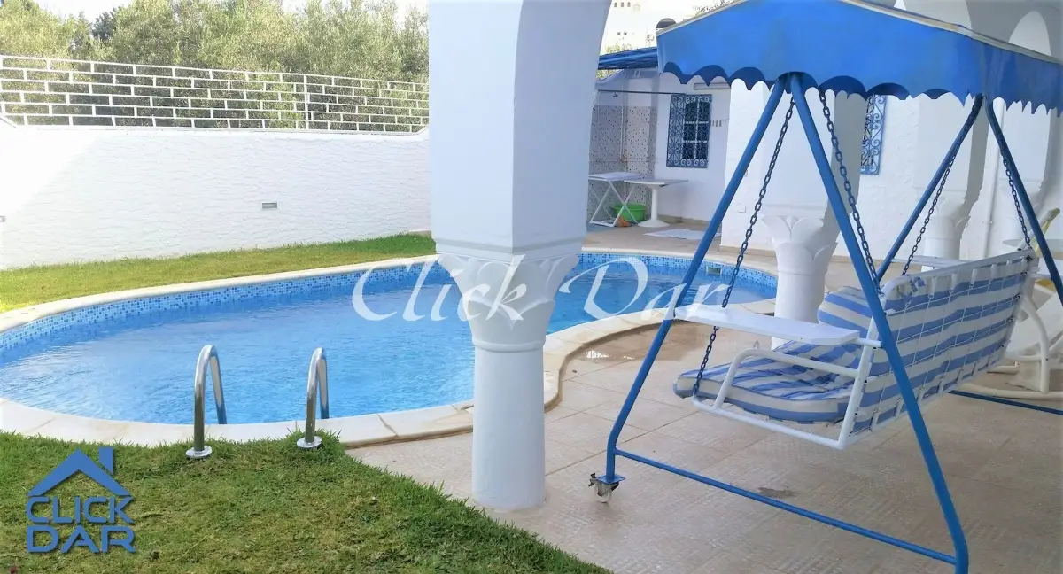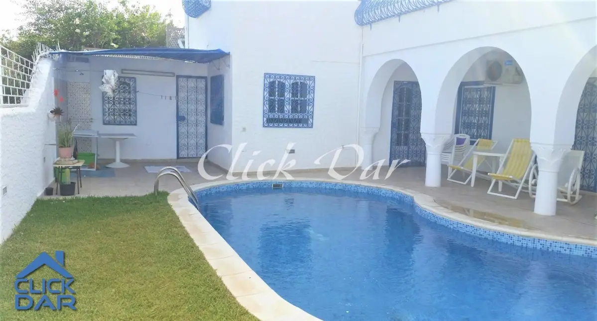 On vous propose pour la location estivale, une villa en S+3 (01 Suite+02 Chambres) avec piscine, située dans un quartier résidentiel calme à Hammamet.