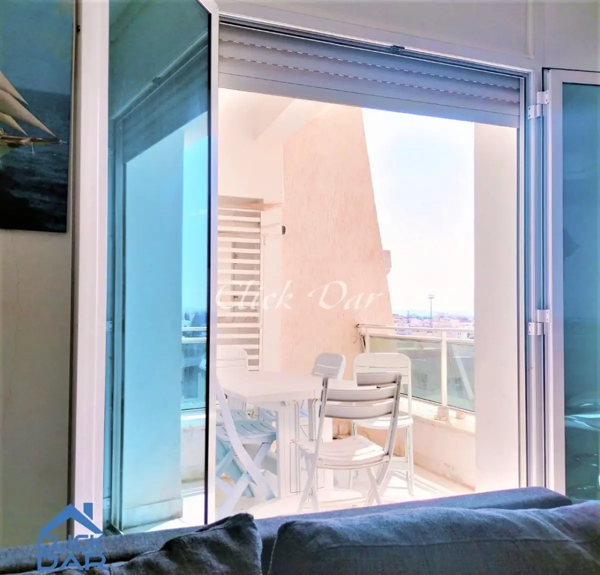 Pour la location estivale, un appartement en S+1, situé dans une résidence sécurisée et gardée pieds dans l’eau, en plein centre ville de Hammamet.