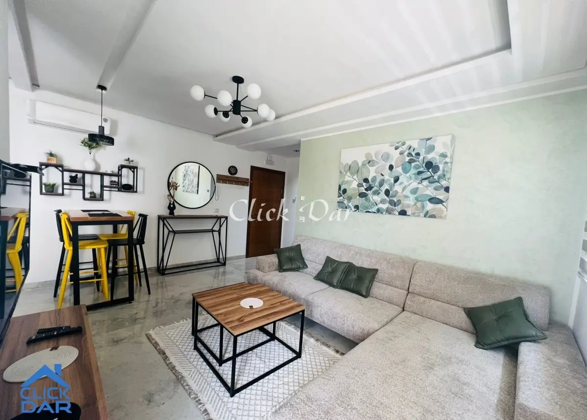 Pour la location estivale, un appartement en S+1 au 1er étage d’une superficie de 64m², dans une résidence ayant une piscine collective et un espace de jeu à l’AFH Mrezga.