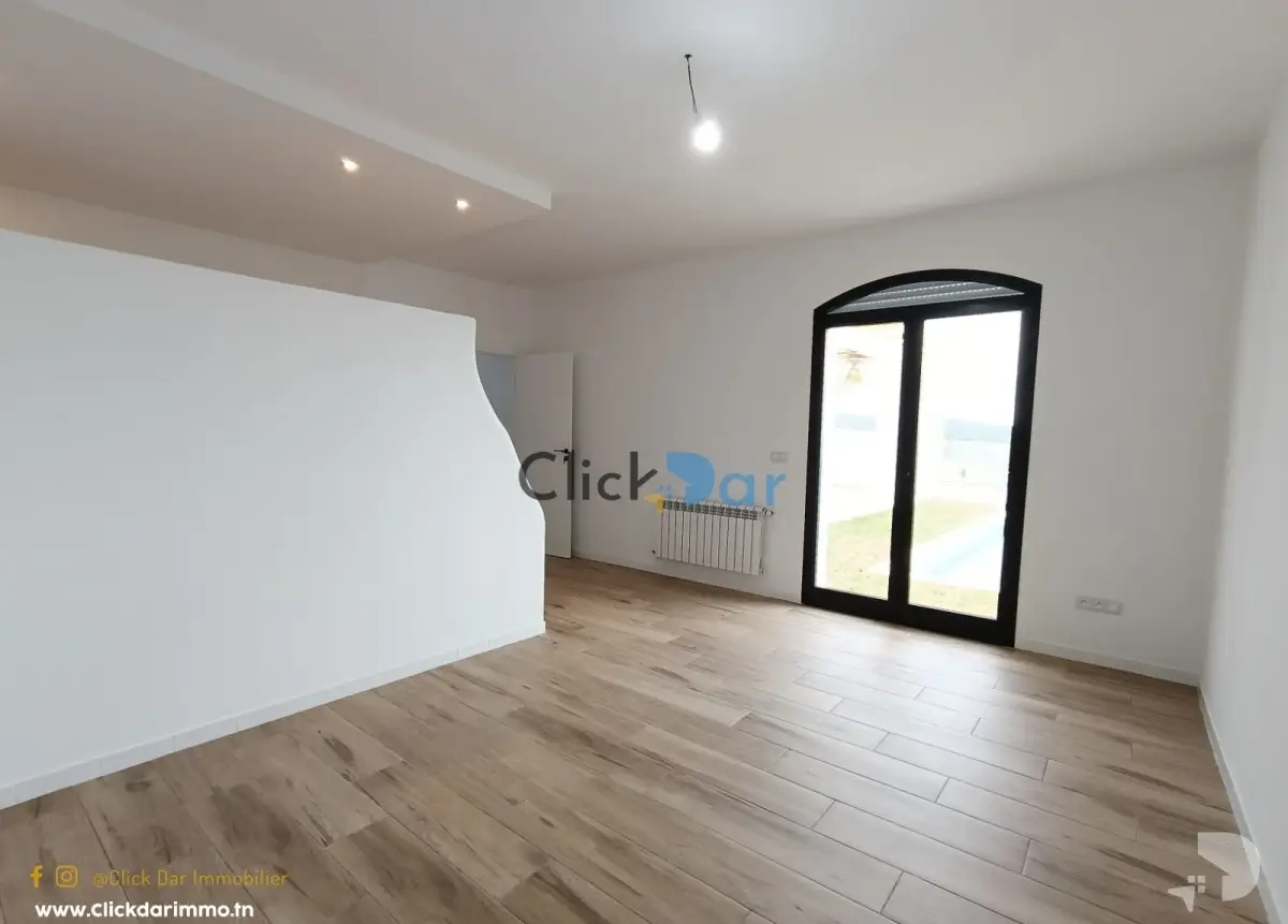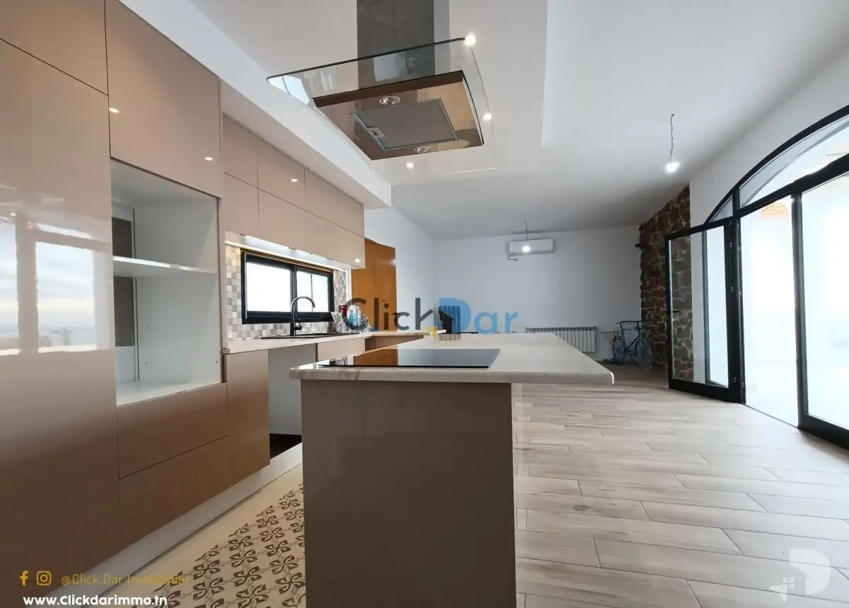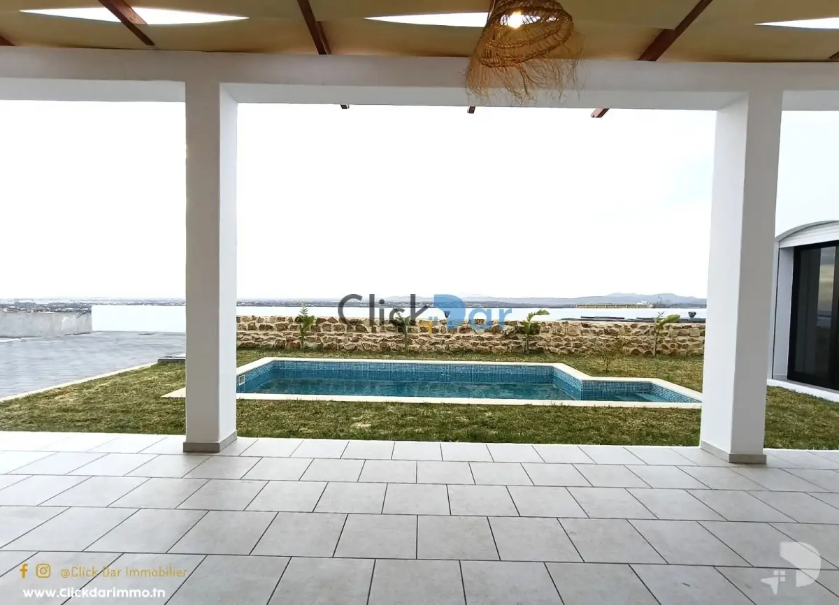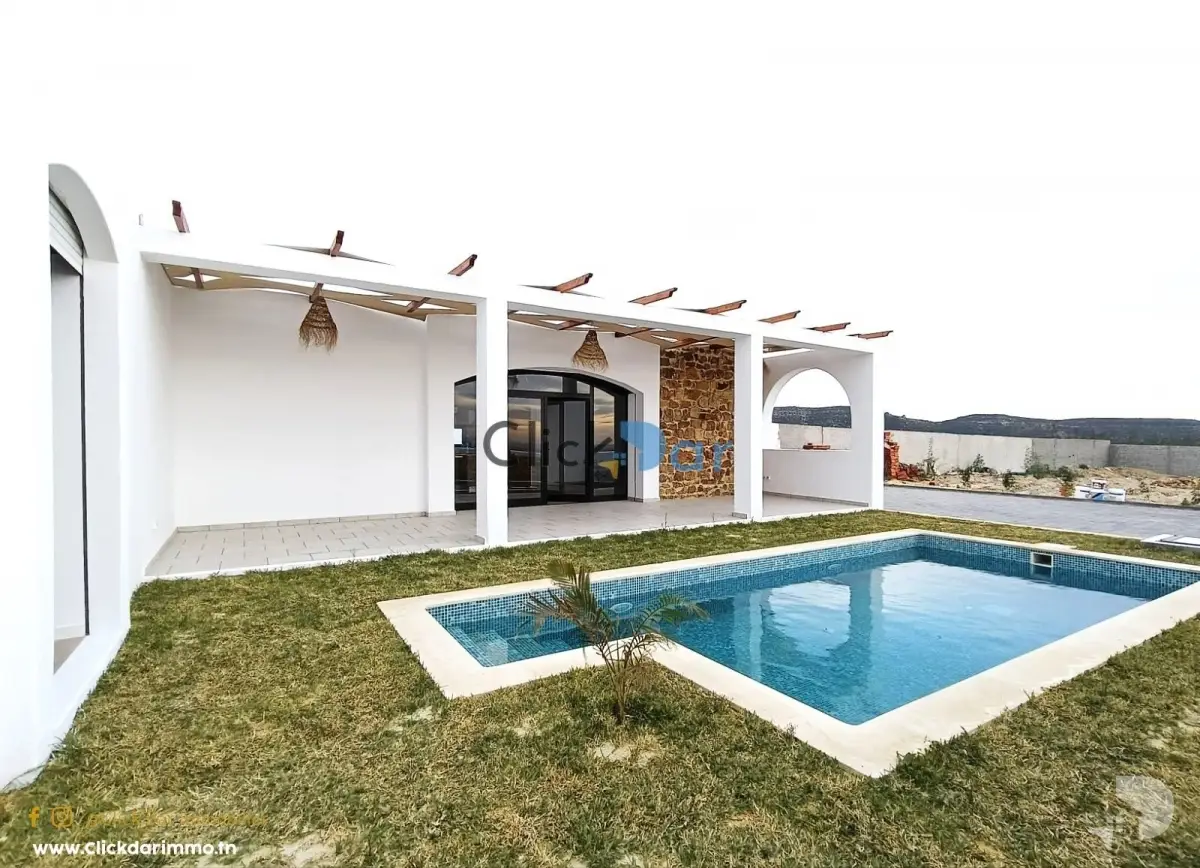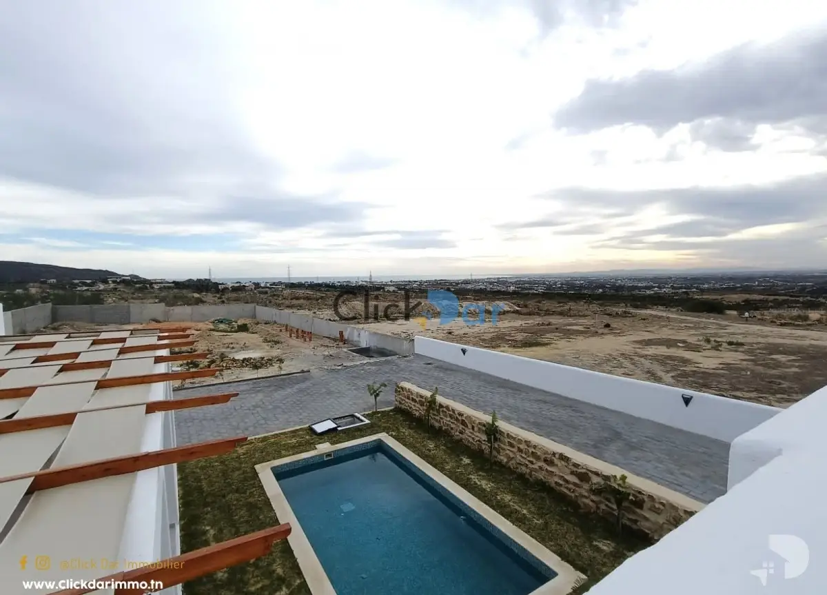 Click Dar Immobilier Hammamet vous propose pour la vente une villa piscine en S+2 en plein pied situé dans un endroit calme à Hammamet avec une magnifique vue de mer et vue de montagne .