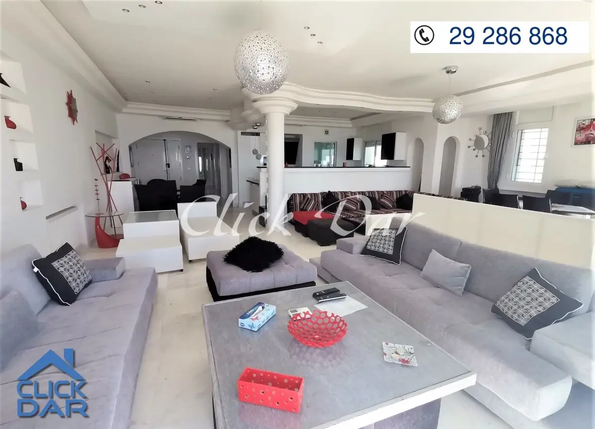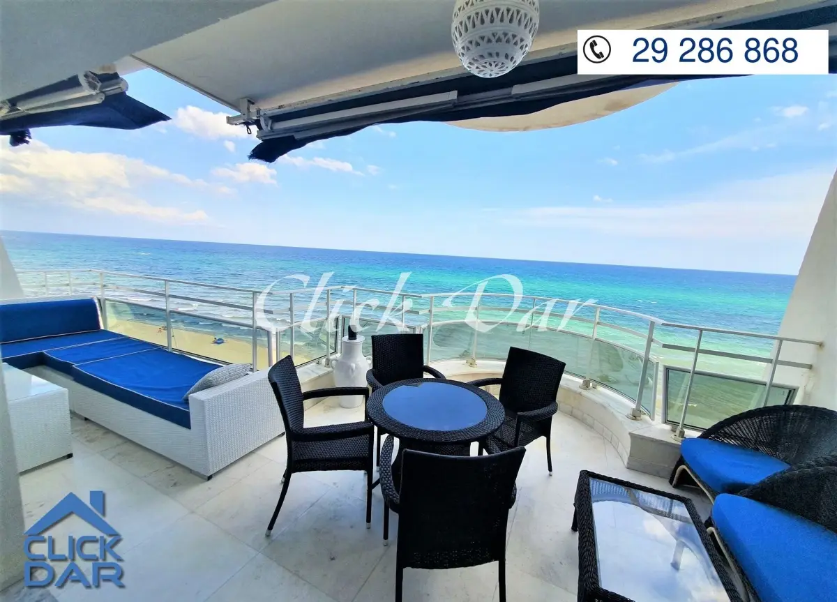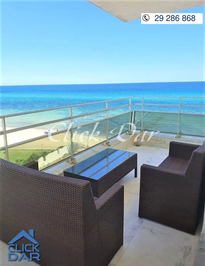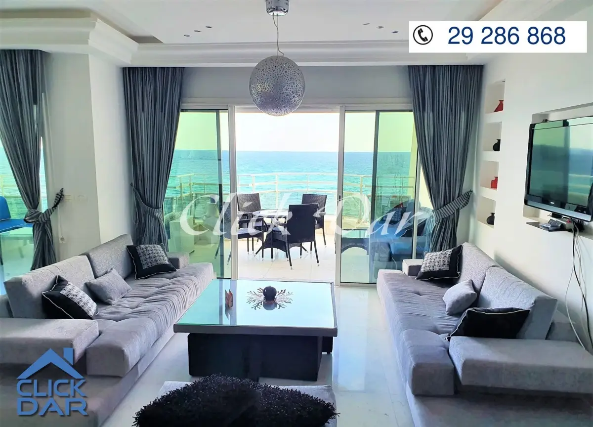 L’agence immobilière « CLICK DAR » vous propose pour la location estivale, un appartement en S+3 avec une vue panoramique sur mer, situé au 4éme étage dans une résidence sécurisée et gardée pieds dans l’eau, en plein centre ville de Hammamet.